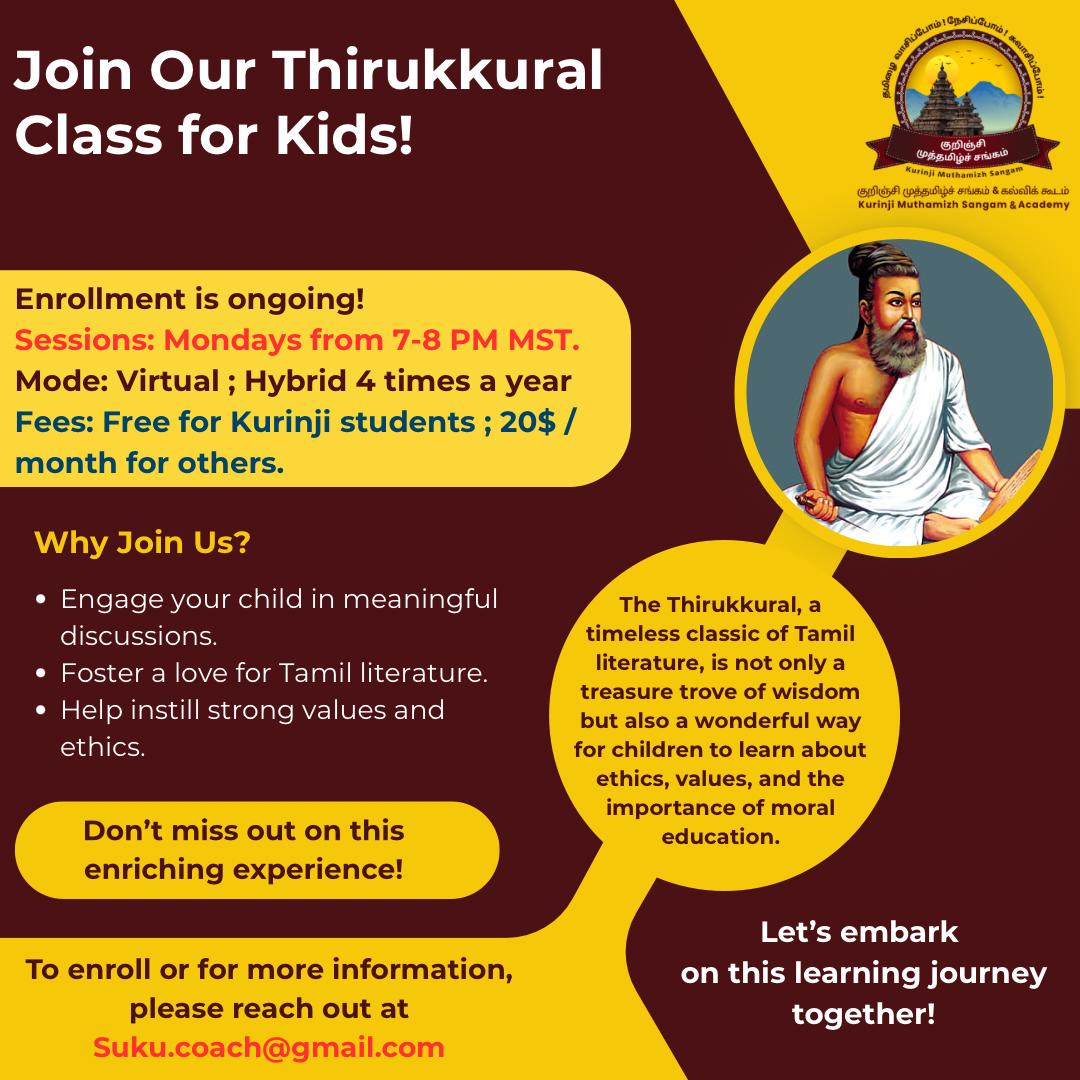 We are excited to announce our Thirukkural class specifically designed for kids! This fantastic opportunity will take place every Monday from 7:00 PM to 8:00 PM MST. The Thirukkural, a timeless classic of Tamil literature, is not only a treasure trove of wisdom but also a wonderful way for children to learn about ethics, values, and the importance of moral education.